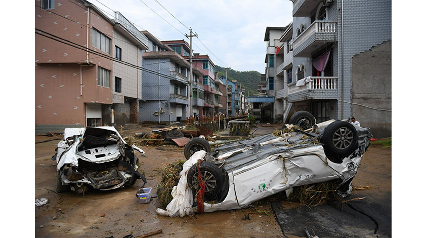 浙江省杭州市富陽區人民政府防汛抗旱指揮部通報稱,22日傍晚至23日淩晨,當地短時強降雨引發山洪致局部山體塌方和泥石流,涉及大源鎮、上官鄉、常綠鎮等地。截至7月23日14時,共有5人死亡、3人失聯(仍在搜救過程中)。圖為7月23日,大源鎮駱村村河道旁的兩輛汽車損毀。 中新社