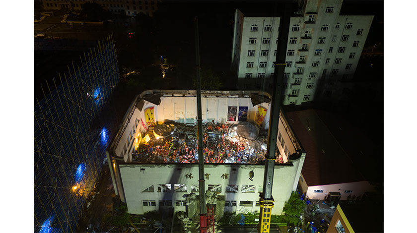 齊齊哈爾第34中學體育館坍塌事故最後一名被困人員已搜救到 共造成11人死亡,這是7月24日拍攝的齊齊哈爾市第34中學體育館樓頂坍塌事故搜救現場。新華社
