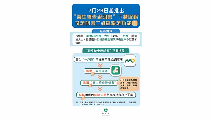 【特訊】為進一步推動智慧醫療發展,向居民提供便利,衛生局今日起於“一戶通”內“我的健康”推出“醫生檢查證明書”下載服務,以及同步推出證明書二維碼驗證功能。此服務及功能只適用於推出當日或之後(即7月26日或之後),且僅由仁伯爵綜合醫院或衛生中心簽發的“醫生檢查證明書”。