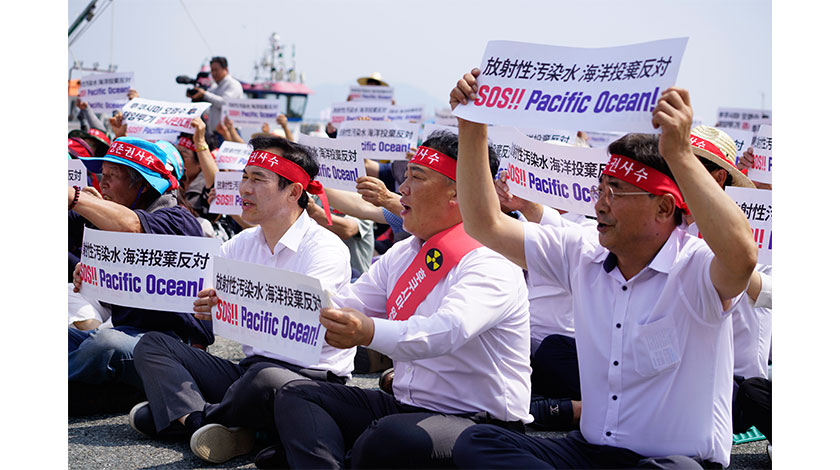 當地時間7月26日下午,韓國全國漁民會總聯盟在全羅南道寶城郡栗浦碼頭一帶舉行陸地集會和海上示威,強烈反對日本核污染水排海。圖為民眾進行海上示威。 中新社