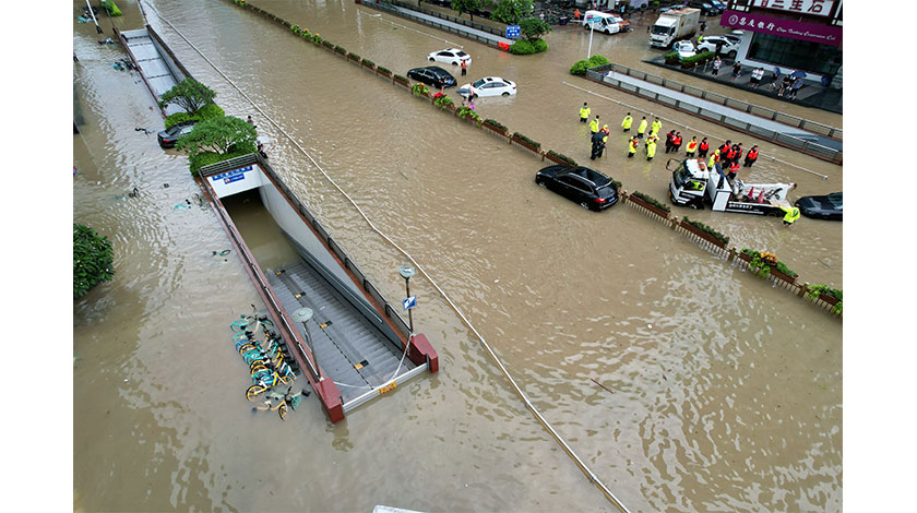 7月29日,福建福州,空中俯瞰被水淹沒的五四路。今年第5號台風“杜蘇芮”28日9時55分登陸福建後,給福州帶來持續強降雨,造成多地受淹出現內澇。(無人機照片) 中新社
