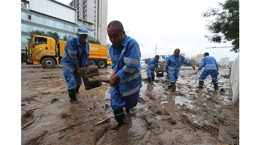 1日,北京市門頭溝區,北京環衛集團的工人在馮石環路上開展清淤作業。圖為工人從淤泥中搬出隔離護欄,便於大型機械開展作業。 中新社