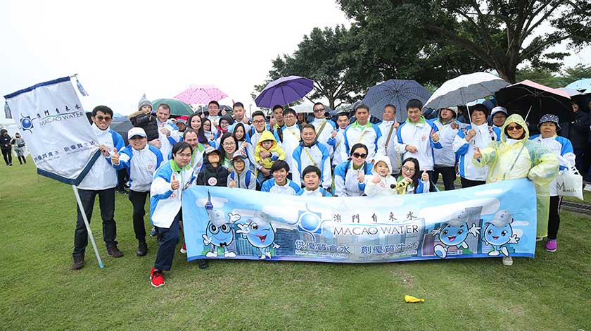 澳門自來水每年都鼓勵和推動員工參與百萬行活動,讓各部門員工齊聚一堂,藉此增進同事間的感情,當中不少同事攜家帶眷參與,支持公益兼享受天倫之樂,以身作則向下一代灌輸為善最樂的理念。活動當天,澳門自來水一行約 50 人的百萬行大軍,穿著公司運動服,浩浩蕩蕩到達會場,整裝待發,寒風細雨亦無阻眾人的熱情。
