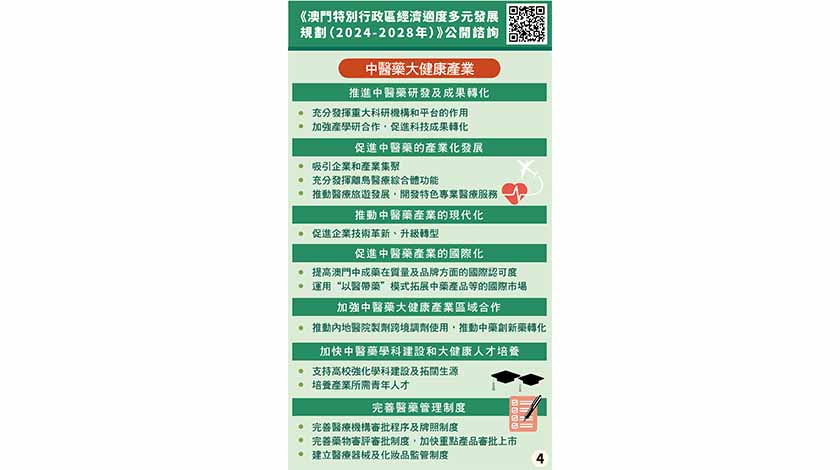 【本報訊】澳門特區經濟適度多元發展規劃(2024-2028年)諮詢文本,提到「規劃背景與總體要求」,指出,當前澳門進入傳統產業升級轉型、新興產業起步發展的關鍵時期。鞏固提升優勢產業和聚力發展新興產業、優化經濟結構,以更大作為加快推動澳門經濟適度多元發展是澳門特區政府首要的重點施政任務。