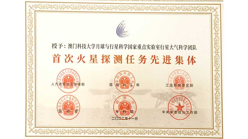 澳科大於2023年8月4日收到國家六部委(人力資源社會保障部、國防科工局、工業和信息化部、國資委、中科院、中央軍委政治工作部)授予參與火星任務的澳科大團隊「首次火星探測任務先進集體」及「首次火星探測任務先進個人」(澳科大太空科學研究所肖靜助理教授) 獎狀,表彰澳科大科學家開發的多尺度火星氣候數值模型與為「天問一號」在火星著陸時間及地點提供的最優方案。