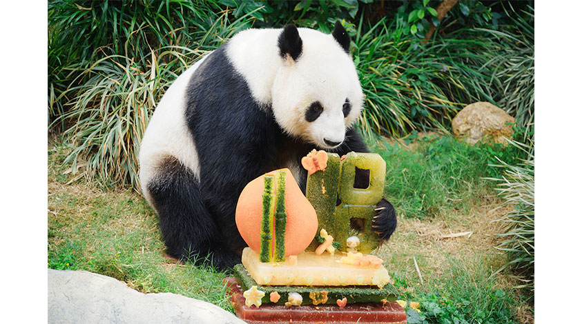 【圖片新聞】 香港海洋公園為大熊貓送蛋糕慶祝18歲生日。8月9日。香港海洋公園為大熊貓盈盈和樂樂送上生日驚喜,慶祝兩位八月之星踏入18歲。盈盈和樂樂是公園最具代表性的動物大使。蛋糕以充滿夏日氣息的蜜桃粉橙色作主調,配以森林綠色的生日歲數冰棒,再加上盈盈和樂樂最愛吃的竹子、紫薯、胡蘿蔔及梨汁作材料。(香港中通社)