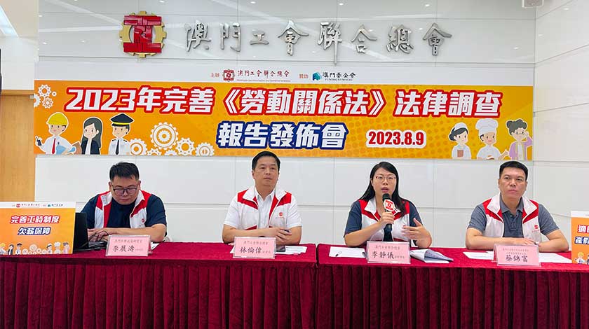 工聯於今年六月至七月展開“二○二三年完善《勞動關係法》法律問卷調查”,收回有效問卷一千六百零八份。問卷調查中,受訪者關注首三位為﹕工作時間、休息休假、僱主僱員的權利義務。接近六成受訪者認為現行《勞動關係法》對工人權益保護不足,整體受訪者對優化工作時間、休假權以及工資保障制度有較高共識和期盼,建議特區政府及早落實《勞動關係法》全面檢討工作,完善僱員權益保障機制。