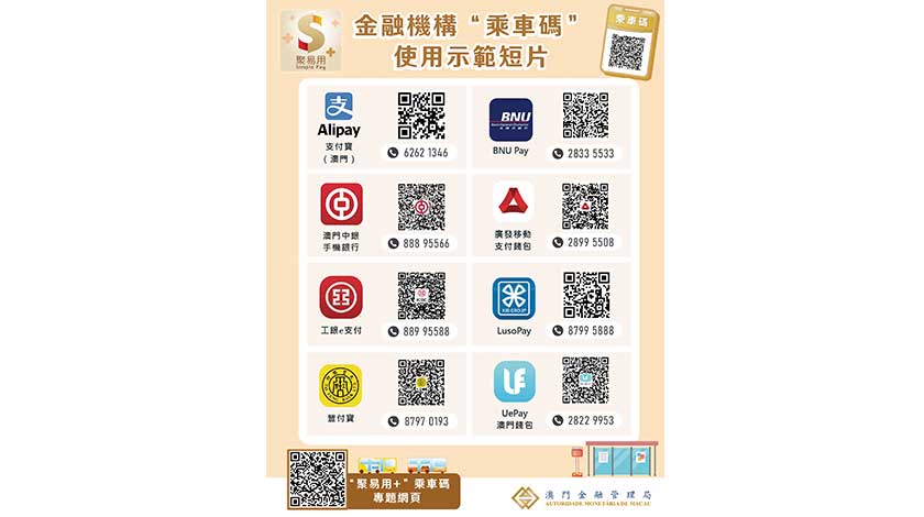 【特訊】為促進移動支付創新及回應社會訴求,經澳門金融管理局協調,今日起,本澳金融機構客戶以“聚易用+”(“Simple Pay+”)任一支付工具,包括支付寶澳門、澳門中銀手機銀行、廣發移動支付錢包、工銀e支付、LusoPay、MPay、豐付寶、UePay澳門錢包,以及BNU Pay,所生成的“乘車碼”支付巴士車資,均可享現有的巴士車資及轉乘優惠(長者、殘疾及學生優惠除外)。“聚易用+”標識將陸續顯示於支付工具APP內及張貼於巴士收費機當眼位置。