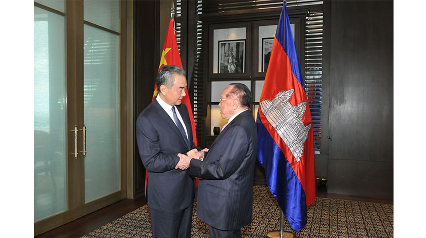 8月12日,中共中央政治局委員、外交部長王毅在金邊會見柬埔寨副首相賀南洪(右)。新華社