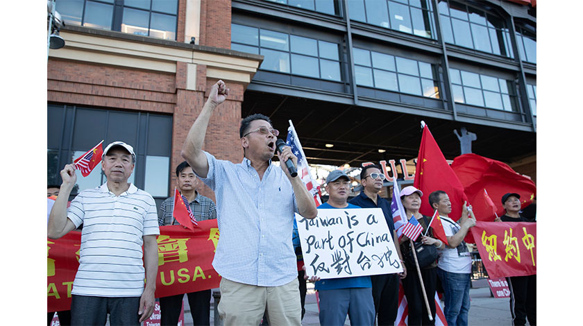 當地時間8月13日,紐約華僑華人社團在賴清德活動場所外高呼反“台獨”口號,抗議其“過境”竄美。 中新社