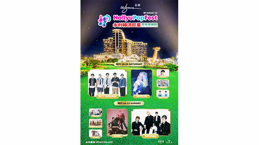 永利將與AEG Presents Asia和H.A.H. Entertainment合作,攜手舉辦HallyuPopFest 2023年澳門站,是次為期兩天的大型音樂節,為金秋 10 月帶來一場熱鬧非凡的盛會。10 個重量級藝人與團隊將登上位於永利皇宮草地的舞台,為廣大樂迷獻上一場震撼的音樂盛宴。領銜嘉賓NCT DREAM 將開啟音樂節的首晚表演,而 SHINee 則會在第二晚擔任領銜嘉賓。為期兩天的活動中,VIP 觀眾將獲邀參加星光熠熠的紅毯活動,與心儀的藝人近距離互動。而 Hi-Wave Meet & Greet 活動也將為粉絲們帶來與他們喜愛的韓流偶像近距離見面的機會。秉承HallyuPopFest 音樂節的傳統,現場將設 HallyuTown 帶來豐富韓國文化體驗,觀眾們可於永利皇宮五彩繽紛的攤位中品嚐到韓式美食、暢飲特式飲品、體驗活動和拍照機會等。