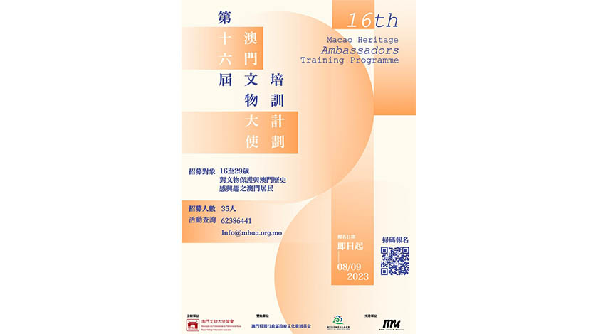 「第十六屆澳門文物大使培訓計劃」由澳門文物大使協會主辦、澳門特別行政區政府文化發展基金和澳門蔡氏教育文化基金會資助,一共招收三十五名「準文物大使」,接受為期68學時的課堂培訓。課程內容涵括澳門歷史、「澳門歷史城區」介紹、中西式建築風格等,亦可學習到有關英語導賞、文化遺產保護法及文化遺產管理研究等知識,期望讓學員可在基礎的課程知識外,還可了解現時本澳文物保育情況,從而促進學員對相關範疇培養出研究興趣以及了解文遺保育的重要性。