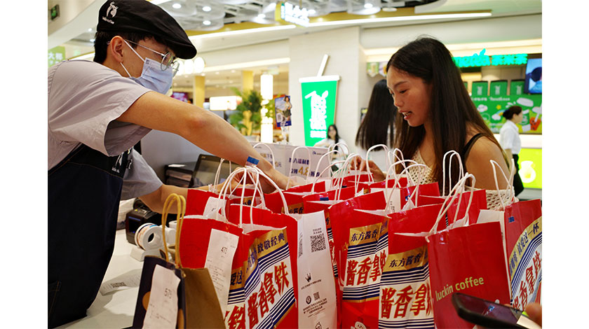 9月4日,瑞幸咖啡與貴州茅臺推出的聯名咖啡“醬香拿鐵”正式上市,零售價38元/杯,使用相關優惠券後到手價約19元/杯。圖為廣東廣州一瑞幸咖啡店店員告知顧客該門店“醬香拿鐵”已售罄。 中新社