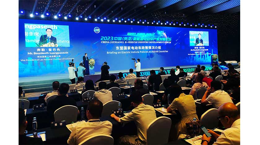 9月8日,2023中國(貴港)新能源電動車產業發展論壇在廣西南寧舉行。與會嘉賓圍繞“把握中國電動車‘出海’的新機遇”等內容展開研討,為高質量發展新能源電動車產業“把脈開方”。圖為老撾國家工商會副主席奔勒·鑾巴色在論壇上發表主題演講。 (中新社)