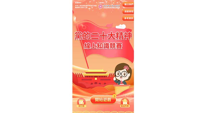 【特訊】為進一步營造學習好、宣傳好、貫徹好二十大精神的社會氛圍,婦聯總會於九月期間推出“黨的二十大精神線上知識競賽”,期望透過搭建居民樂於參與、便於參與的平台,推動全民學習、講好二十大精神,切實把學習成果轉化為各項實際行動,更好開展未來工作,努力開創服務的新局面,奮力譜寫澳門特色“一國兩制”成功實踐的新篇章。