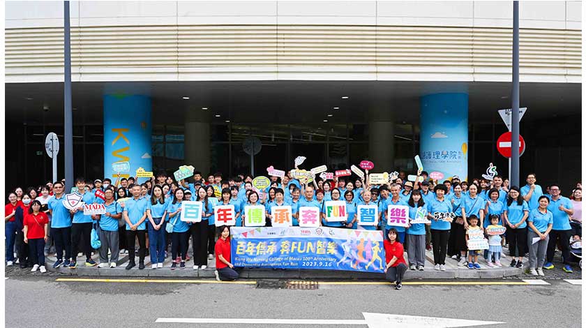 「百年傳承奔FUN智樂」活動於二0二三年九月十六日舉行,這是一個結合體育運動和社會關懷的活動,參加者以步行及跑步方式,傳達澳門鏡湖護理學院百年護理教育的歷史傳承,同時喚起大眾對失智症的關注及宣傳失智症友善的訊息,吸引了逾百名鏡湖護院校友、在校學生、教職員工及公眾參與。當天清晨六時,近二十名跑手齊集鏡湖護院連勝馬路原校址起步,朝離島醫療綜合體校新址出發。上午九時,跑手們聯同步行參加者齊集鏡湖護院離島醫療綜合體校址,由校董會主席劉永誠、校董林燕妮及劉嘉蕊、院長尹一橋,澳門失智症協會理事長李衛燕,鏡湖護院校友會常務副會長梁卓慧、學生會主席陳倩兒,失智症患者家屬吳仕庭先生等主持起步禮。接着,全體參加者沿石排灣水庫步行徑走動一圈,現場洋溢著歡樂愉快的氣氛。