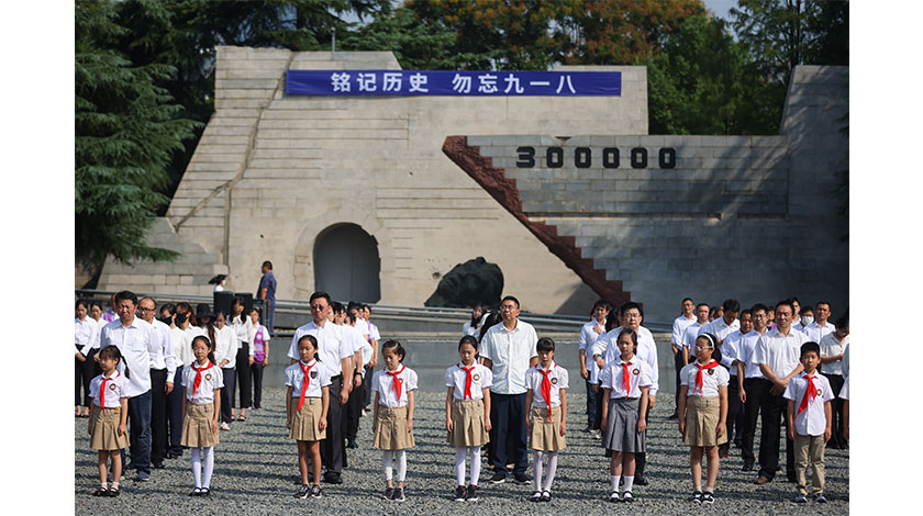 9月18日,江蘇南京,侵華日軍南京大屠殺遇難同胞紀念館舉行“銘記歷史 勿忘九一八”主題教育活動,隨著防空警報聲的響起,民眾默哀。當日為“九一八”事變爆發92周年。 中新社
