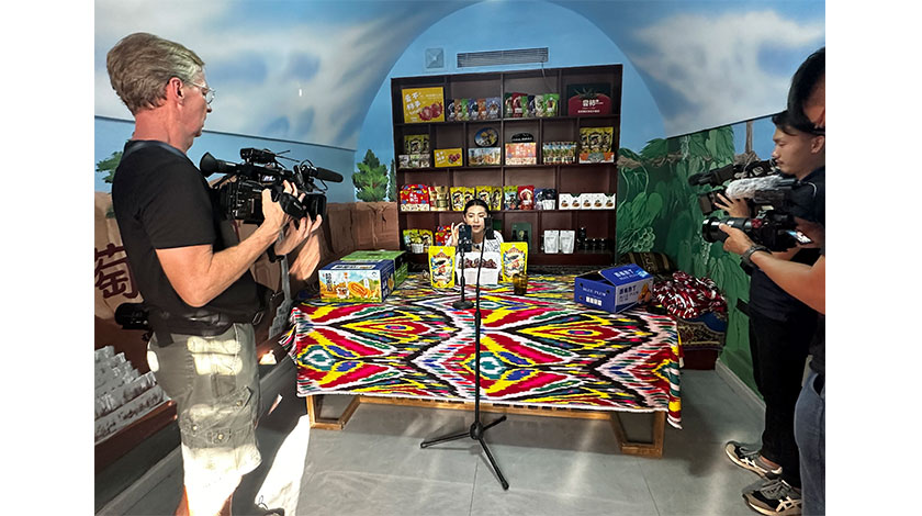 “走進絲綢之路經濟帶核心區”主題採訪活動近日在新疆舉行,22位外國媒體人在一周時間裡先後赴烏魯木齊、吐魯番、伊犁、喀什等地參訪。圖為9月14日,吐魯番,外國媒體人在一家農村電子商務公司採訪拍攝,瞭解企業如何通過互聯網將當地農產品外銷全國。(中新社)