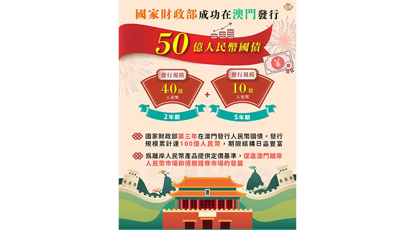 是次國債面向專業投資者發行,總發行規模為50億人民幣,並首次發行5年期國債,補充了澳門債券市場上,中長年期國債的稀缺。其中,2年期的國債發行金額為40億人民幣,發行利率定價為2.4%;5年期國債發行金額為10億人民幣,發行利率定價為2.68%。本次國債的發行受到市場歡迎,獲得超額認購。
