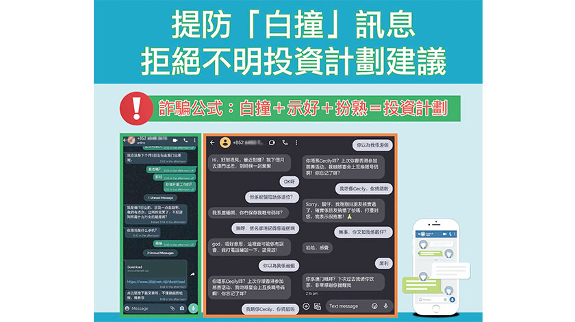 【特訊】近日,司警局發現有騙徒以“白撞”方式透過手機短訊或WhatsApp通訊軟件,隨機向市民發送訊息,內容會先以熟人口吻閒聊作為開場白,隨後會聲稱“入錯號碼”、加錯好友,一旦事主回覆,對方便聲稱與事主有緣繼續閒聊,在取得信任後,便以介紹高額回報的虛擬貨幣或A股投資項目為由,邀請事主下載來歷不明的假投資App。另外,也有部分事主會被加入投資WhatsApp群組,收取“投資貼士”,結果亦被逐步游說參與虛假的投資計劃。
