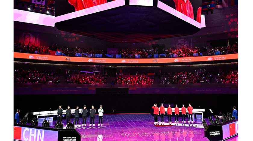 乒乓球女團決賽在拱 運河體育公園體育館舉行,中國國乒女隊3比0戰勝日本女乒,取得亞運會乒乓女團五連冠。