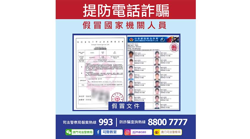 【特訊】近日司法警察局再接獲多名市民舉報,稱收到假冒國家機關人員之詐騙電話,騙徒假冒為國家機關人員以“+852”字頭的號碼致電事主,直接說出事主的姓名及身份資料,並訛稱事主曾寄送涉及犯罪的包裹往內地、在內地開設手機號碼發送大量詐騙短訊,或訛稱事主牽涉內地重大刑事案件等等,要求事主配合“內地公安機關”調查。