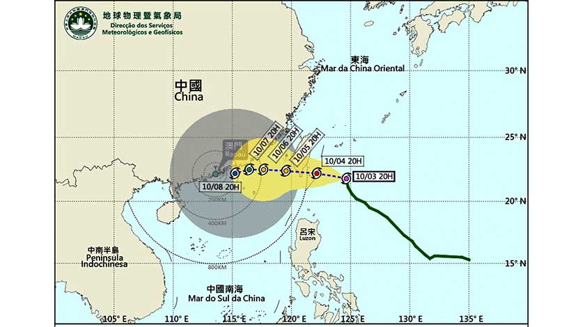 澳門氣象局預料,「小犬」將於今日晚間至明日凌晨移入南海並進入本澳八百公里範圍。同時,一股東北季風將於明日日間抵達華南,受其影響,「小犬」強度變化及路徑存有不確定性, 但預料強度將會有所減弱。