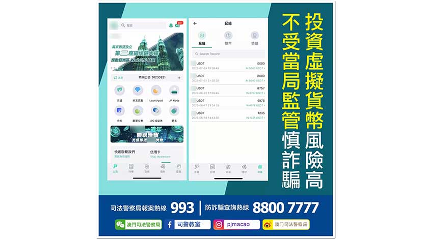 司警局提醒市民,虛擬貨幣於本澳並非法定貨幣,僅屬虛擬商品,且有關交易屬投機及極高風險,市民應先對有關商品作充份瞭解及認識,不應盲目跟隨,慎防被騙或可能被利用作清洗黑錢等違法活動。如懷疑被騙,應立即致電司警局防詐騙查詢熱線88007777或報案熱線993求助。