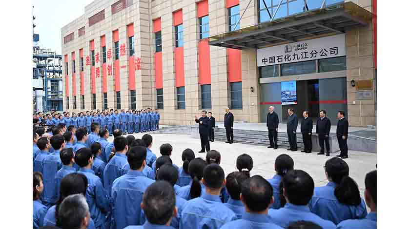 10月10日下午,習近平總書記在江西省九江市先後考察了長江國家文化公園九江城區段、中國石化九江分公司,了解當地長江國家文化公園建設、長江岸線生態修復、石化企業轉型升級綠色發展等情況。這是習近平在中國石化九江分公司考察。 新華社