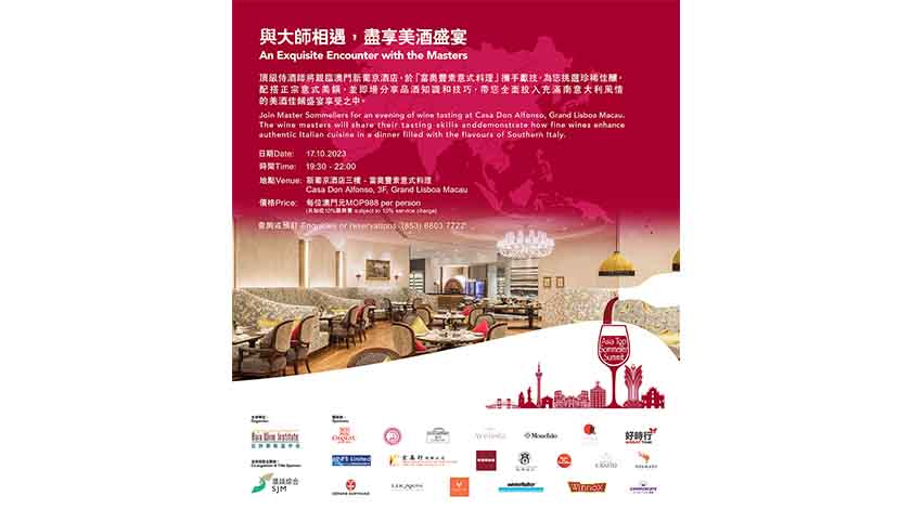 「與大師相遇,盡享美酒盛宴」將於10月17日在新葡京酒店的「當奧豐素意式料理」舉行,CMS侍酒大師公會主席Brian Julyan及首席執行官Ronan Sayburn兩位大師將於席間與賓客分享品酒知識和技巧。晚宴精選五款珍稀佳釀配搭餐廳匠心呈獻的五道正宗南意大利美饌,盡享完美餐飲體驗。美酒盛宴於10月17日晚上7時30分至10時舉行,有關查詢或預訂,可致電 (853) 8803 7722。