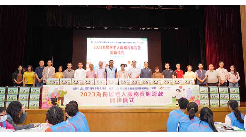 街坊總會當天下午在該會社區服務大樓舉行「2023為獨居老人服務賣旗籌款」開箱儀式,社工局長者服務處職務主管鄭榆強、街坊總會會長吳小麗、理事長陳家良、監事長梁慶球、副會長何潤生、黃華強、張麗珍、江超育等嘉賓主持開箱儀式。
