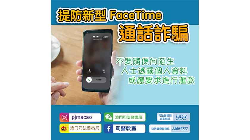 司警局反詐騙協調中心呼籲市民,小心提防陌生的FaceTime來電,切勿輕信自稱客服人員打來的電話,不要隨便向陌生人士透露個人資料或應要求進行匯款,應循有關公司或機構之官方途徑進行查詢核實情況。