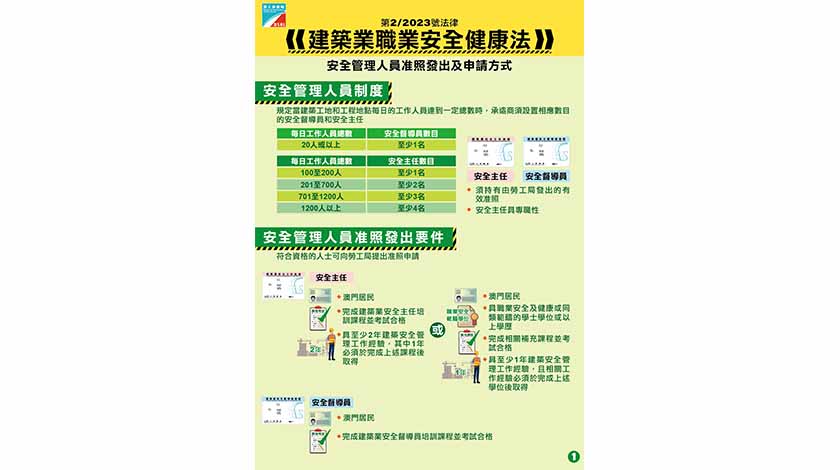 【特訊】第2/2023號法律《建築業職業安全健康法》即將於本年11月1日正式生效,為提升建築工地和工程地點的安全管理,新法規範了安全管理人員必須持有由勞工事務局發出的有效准照。