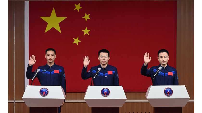 10月25日11時,執行神舟十七號載人飛行任務的航天員乘組湯洪波(中)、唐勝傑(右)、江新林(左)3名航天員在酒泉衛星發射中心問天閣與中外媒體記者集體見面。 中新社