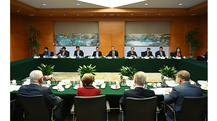 當地時間10月28日,中共中央政治局委員、外交部長王毅在華盛頓同美國工商業等各界代表座談。 中新社