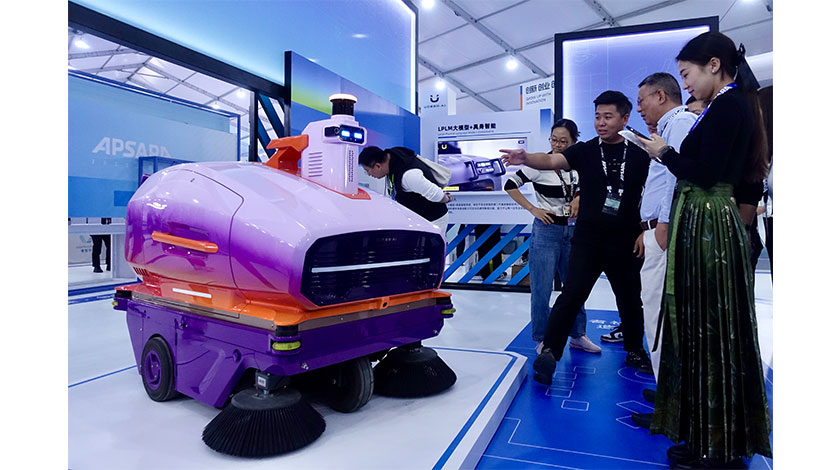 11月1日,一台可以進行雲交互的戶外掃地機器人吸引參觀者圍觀。近日,2023杭州·雲棲大會在浙江杭州舉行,本次大會設置展覽展示面積約4萬平方米,共有3000余項技術、產品參展,集中展示前沿技術、最新成果和重點產業領域新技術新產品。 中新社