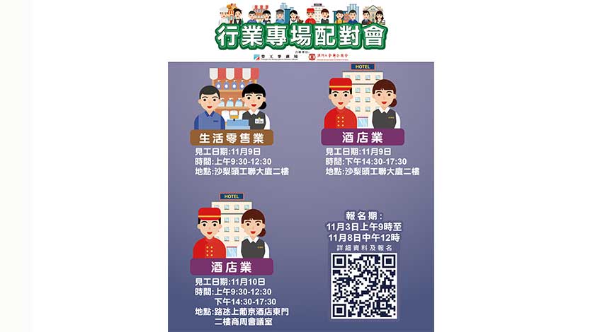 11月9日上午舉辦生活零售業配對會,提供266個職位空缺,涉及分區經理、見習經理、店務副經理、店務組長、醫學美容顧問及店務員等。下午舉辦酒店業配對會,提供57個職位空缺,涉及餐飲部部長、餐飲服務員、房務員、工程部技術員、洗衣房服務員、前台服務員、中餐廚師及廚師助理等。以上配對會在澳門工會聯合總會二樓(沙梨頭海邊街2-6號工聯大廈)舉行。