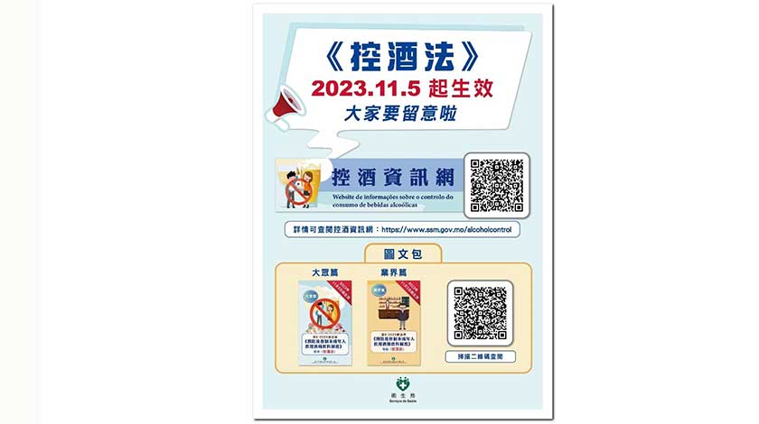 衛生局提醍,《控酒法》禁止任何人向未成年人(即未滿18歲人士)銷售或提供酒精飲料;銷售或提供酒精飲料的地方,須以顯眼方式張貼經行政長官批示核准禁止向未成年銷售或提供酒精飲料的標誌;同時規定,屬提供自助服務的商業場所須劃定及清晰標示陳列酒精飲料及非酒精飲料的區域,而酒精飲料的廣告,應以中文、葡文及英文標明警語,呼籲相關業界遵守法規。