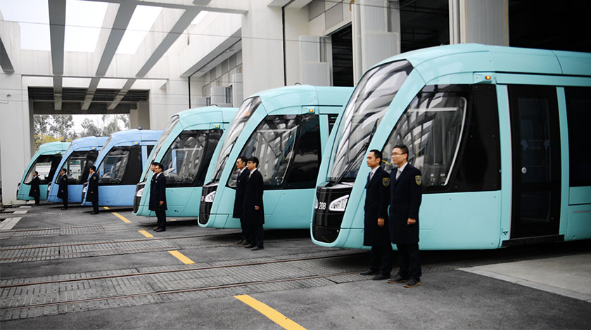 12月11日,四川成都,即將投入試運行的有軌電車和年輕司機們集體亮相。當日,成都首條有軌電車蓉2號線首開段工程進入試運行前的最後衝刺,沿線所有標誌標線與出行導向全部到位,預計2018年底開通試運營。(中新社圖片/ 劉忠俊 攝)