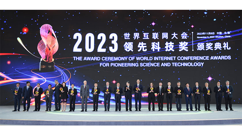 11月8日,15個獲獎項目的代表參加頒獎儀式併合影。當日,世界互聯網大會領先科技獎頒獎典禮在浙江烏鎮舉行,15個項目獲獎,涵蓋人工智能、車聯網、網絡安全、智慧醫療等前沿領域。 中新社