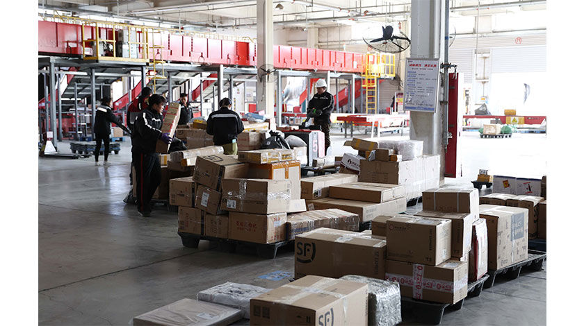 11月9日,工作人員在寧夏銀川順豐轉運中心搬運快遞。連日來,各快遞公司加緊進行騰倉擴容,加快物流速度,提昇服務質量,全力迎戰“雙十一”快遞物流高峰。 中新社