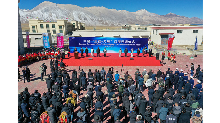 11月13日,西藏自治區裡孜口岸正式通關,駐守該口岸的裡孜邊檢站迎來首批入境旅客。裡孜口岸位於西藏日喀則市仲巴縣境內,與尼泊爾木斯塘縣乃瓊口岸相對應,海拔4772米,為目前西藏自治區海拔最高邊境口岸。圖為口岸開通儀式現場。中新社
