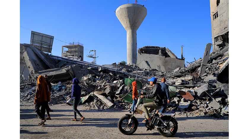 11月17日,在加沙地帶南部城市汗尤尼斯,人們走在遭以色列襲擊後的建築廢墟前。新華社