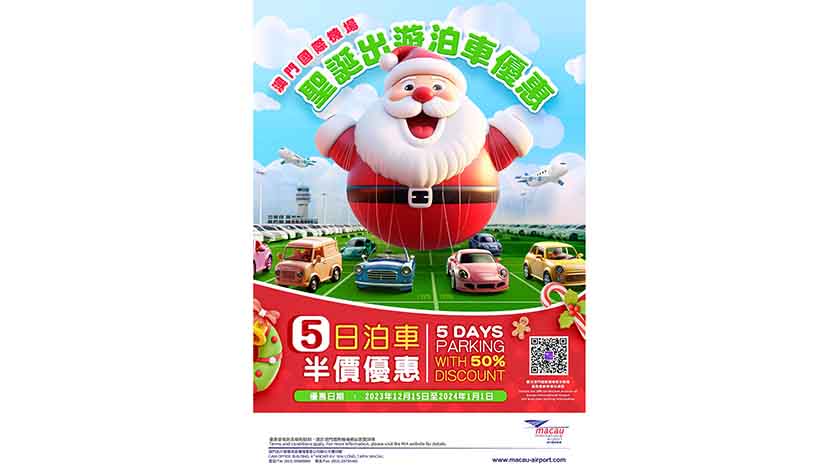 【特訊】為答謝本澳市民對澳門國際機場的長期支持,由2023年12月15日至2024年1月1日,凡於澳門國際機場出遊的旅客可享最多連續5日泊車半價優惠,優惠適用於澳門國際機場南面及北面停車場。