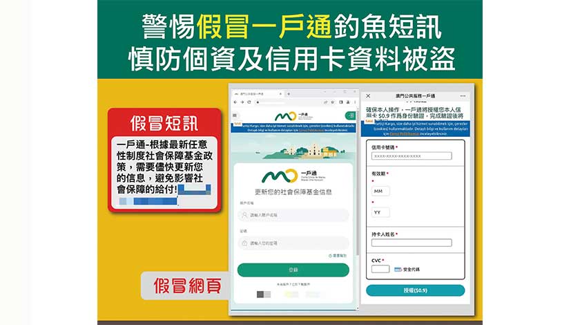 【特訊】司法警察局昨日接獲社會保障基金檢舉,指有人冒充社會保障基金發出釣魚短訊,內容以更新個人訊息為由,要求市民點撃短訊內附帶的連結,否則將會影響社保的給付。