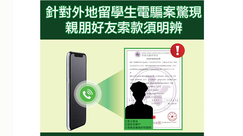 【特訊】司警局近日接獲市民舉報,指其在外地留學之兒子早前誤墮俗稱「公檢法」之電話詐騙,除在當地自行轉賬了一筆巨款予騙徒外,更在騙徒唆使下向家人籌集另一筆巨款再悉數轉賬予騙徒,事件中被害人合共損失逾350萬澳門元。