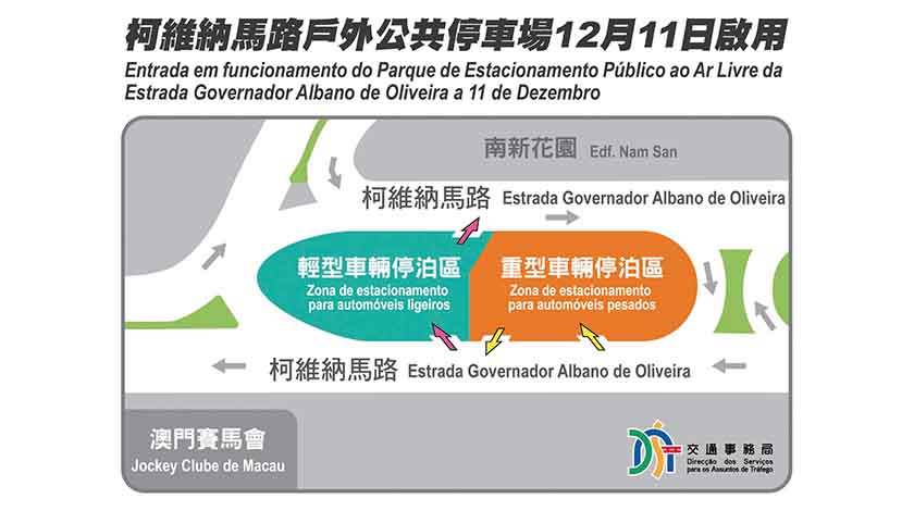 【特訊】位於氹仔柯維納馬路的“柯維納馬路戶外公共停車場”,由12月11日(周一)上午10時起對外開放使用,提供41個輕型汽車及17個重型汽車泊車位。停車場不設月票,所有停泊車輛按時收費,輕型汽車日間(上午8時至晚上8時前)每小時或不足1小時8元,夜間(晚上8時至翌日上午8時前)4元;重型汽車日間每小時或不足1小時10元,夜間5元。