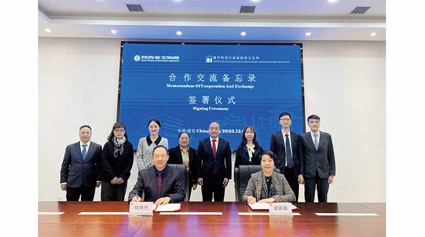 簽署儀式昨日在陝西省文物局舉行,由澳門特別行政區政府文化局局長梁惠敏、陝西省文物局副局長錢繼奎共同簽署《陝西省文物局與澳門特別行政區政府文化局合作交流備忘錄》,雙方就展覽合作、文物資源的推廣與運用、文化遺產保護等工作領域進行交流,促進澳門文博單位在文物保護、研究、教育推廣等各方面的發展。此外,2024年為澳門回歸祖國25周年,雙方協議屆時在澳門博物館舉辦文物精品展,以表慶祝。