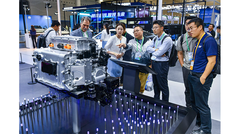 12月7日,2023世界新能源汽車大會技術展覽在海南海口舉行,展覽面積達10000平米,約50家全球新能源汽車領域企業參與展示。圖為參觀者參觀展出的氫能驅動電機。 中新社