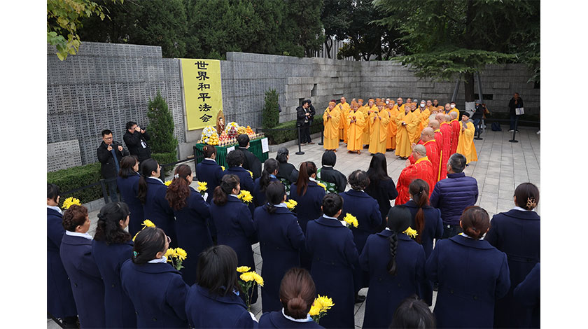 12月13日,江蘇南京,“世界和平法會”在侵華日軍南京大屠殺遇難同胞紀念館遇難者名單牆前舉行,祭奠南京大屠殺死難者,祈願和平。當日為第十個南京大屠殺死難者國家公祭日。圖為“世界和平法會”現場。中新社